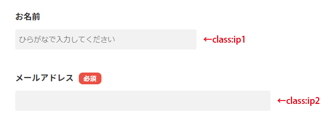 メールアドレスは長いアドレスの方もいますので、class:ip2をあわせて使って入力欄を少し長めにしましょう。