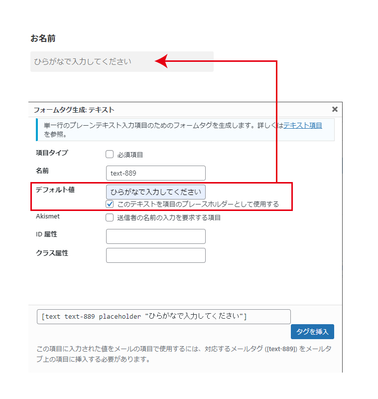 デフォルト値を入力する際は「このテキストを項目のプレースホルダーとして使用する」にチェックを入れるのは忘れないようにご注意ください。